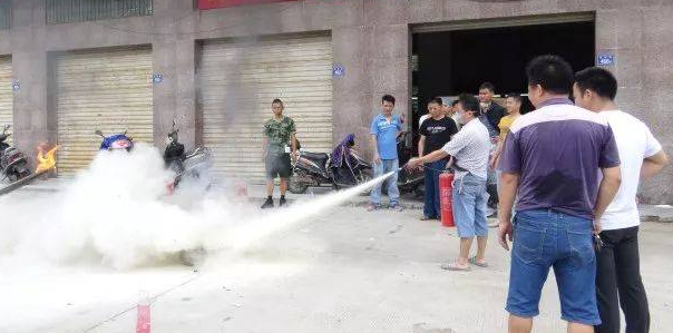 第五步,在距離火焰兩米的地方,右手用力壓下壓把,左手拿著噴管左右擺動,噴射整個燃燒區。