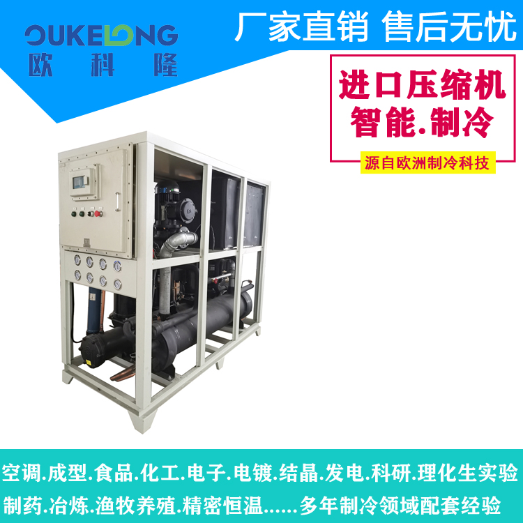 歐科隆40匹Ex防爆水冷箱式冷水機組是一款通過國家防爆認證(Ex dⅡB T4 Gb)的專業(yè)工業(yè)制冷設(shè)備,制冷量140kW,專為石油、化工、制藥等易燃易爆環(huán)境設(shè)計。機組采用正壓防爆箱體結(jié)構(gòu),關(guān)鍵防爆部件均符合ATEX標(biāo)準(zhǔn)。